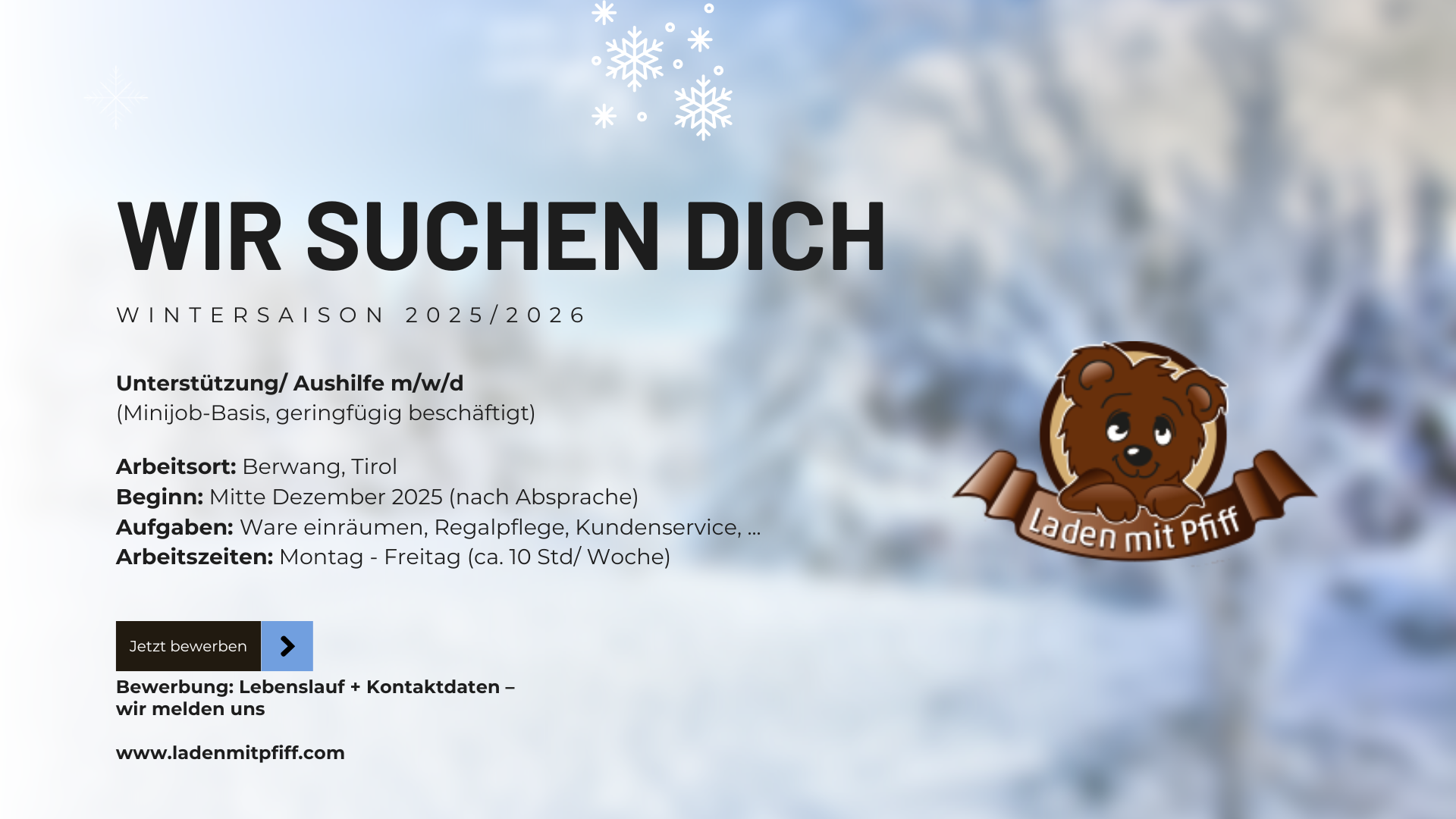 Bewirb dich jetzt schriftlich oder via Mail: info@ladenmitpfiff.com